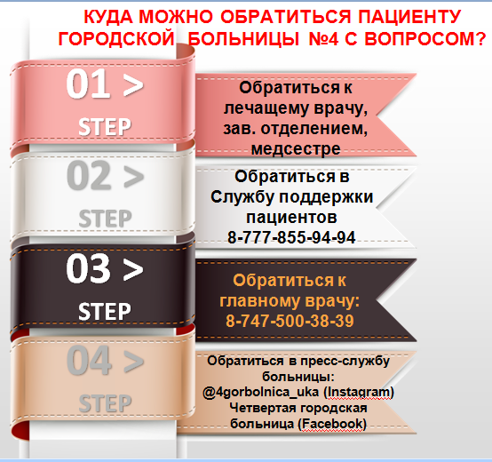 ВАРИАНТ №4. Также Вы всегда можете обратиться в пресс-службу больницы, написав в Direct нашего аккаунта в Instagram (@4gorbolnica_uka) или Messenger на Facebook (Четвертая городская больница). Мы в оперативном режиме направим Ваш вопрос компетентному сотруднику больницы.